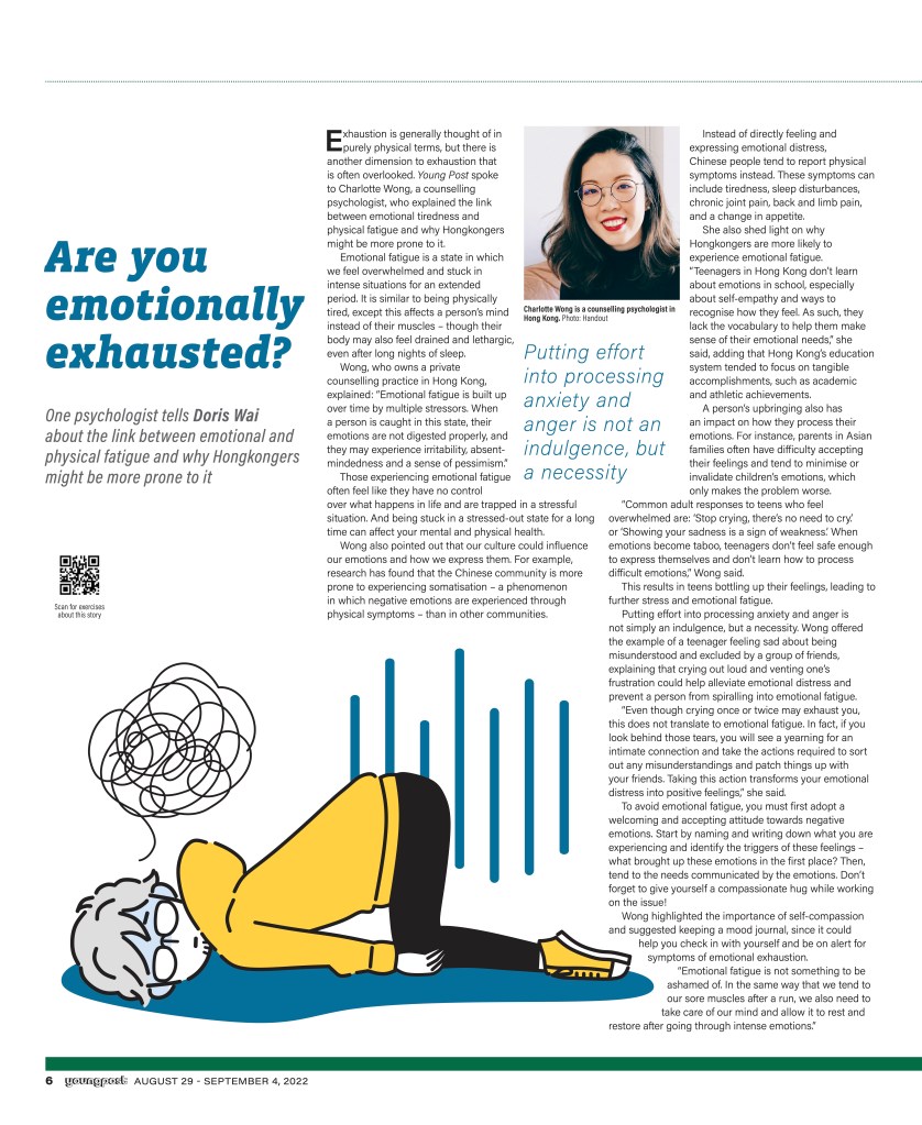 Exhaustion is generally thought of in purely physical terms, but there is another dimension to exhaustion that is often overlooked. Young Post spoke to Charlotte Wong, a counselling psychologist, who explained the link between emotional tiredness and physical fatigue and why Hongkongers might be more prone to it.